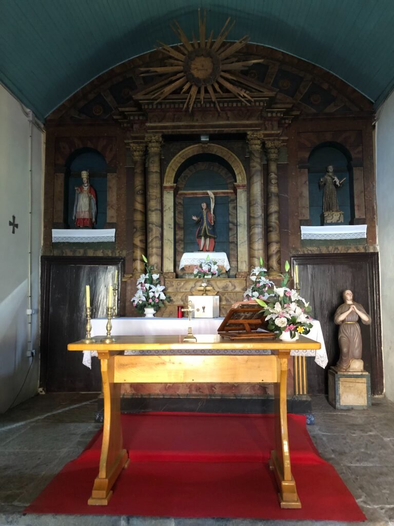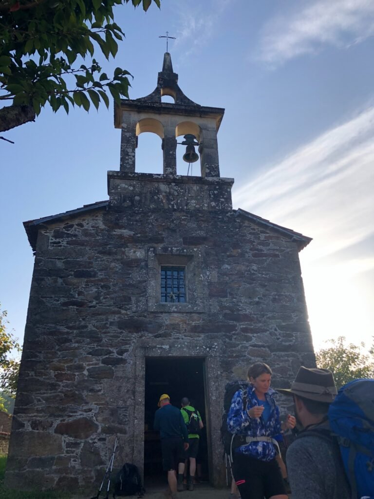 As we left the forest behind us, we entered into the small villages located on the outskirts of Santiago. There was a beautiful little chapel, and my friends who I have walked with off and on from Oviedo — Enrique (Spain) and Cleber (Brazil) — stopped to pay our respects at the church, to get a stamp in our credencial, and of course snap a couple of photos! 😉