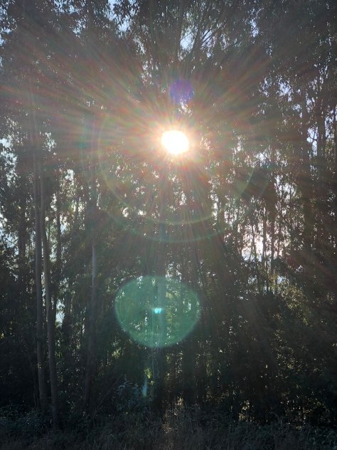 As we kept walking through the fields and forest, we could see the sun slowly rising in the east as it started to shine through the trees.