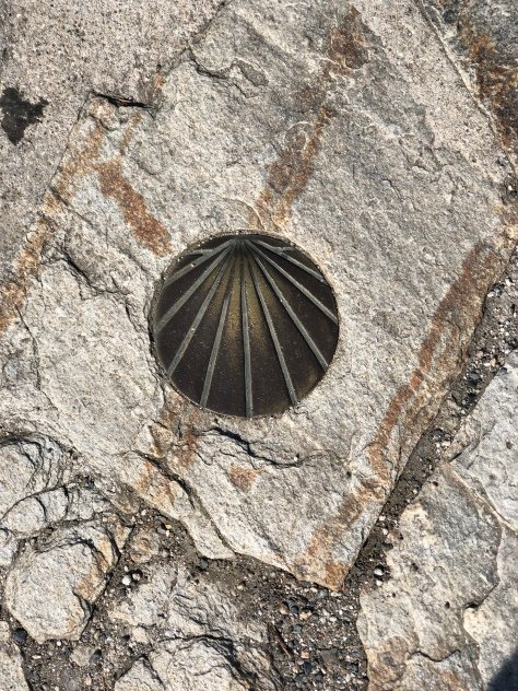 After passing this sign we started to enter the winding streets of the beautiful city of Santiago. As we passed the newer parts of the city, we began winding our way down to the old part of town and the cathedral. The excitement was building…especially as we walked through the lovely narrow streets and saw other pilgrims and their excitement! I glanced down beneath my feet and saw the first scallop shell in the old part of Santiago: