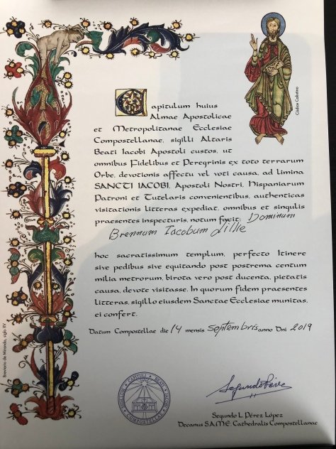 After the singing and hugs and handshakes and eating a Spanish tortilla and having a few beers, it was my turn to get my Compostela. As I went through the process, i showed the man behind the counter my credencial de peregrino with all of the sellos (stamps) from Oviedo to Santiago, and described some of my adventures. He was gentle and kind, listening intently and smiling knowingly as I told my tale. He then, very carefully, wrote my name in Latin on the Compostela — and here it is: